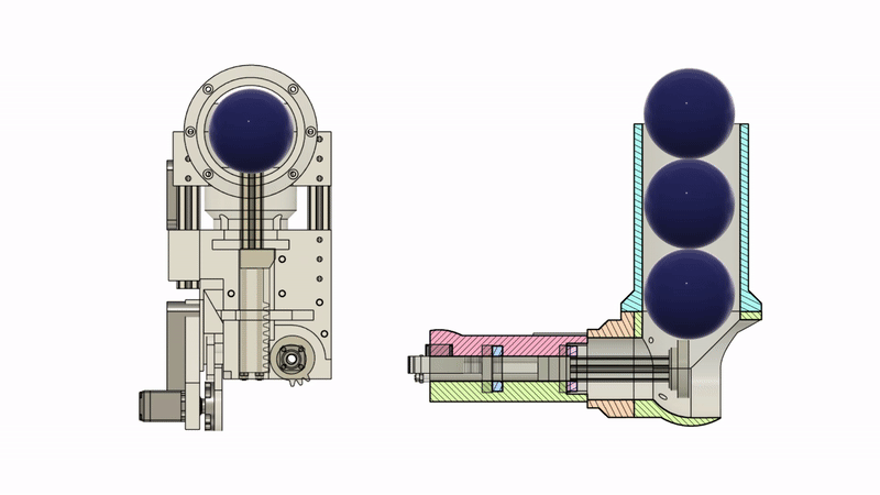 Leveraging past experience from land vehicle competitions the team decided to implement a puncher mechanism. A DC motor powers the driving gear, which contains only 3 teeth. The gear compresses the spring by drawing back the rack on the punching rod, as the drive gear continues the rotation, the rack slips and the punching rod launches the racquet ball towards the Black Vessels.