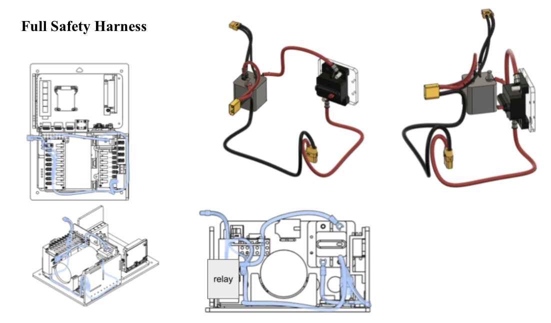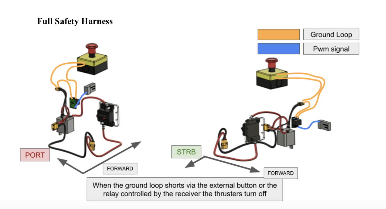 The safety system comprises an onboard external button, in addition to a remote kill system that utilizes a relay activated by a channel from the receiver. The remote kill system will activate when Barco Polo or Crusader loses connection to the transmitter or in the event of a transmitter power loss.