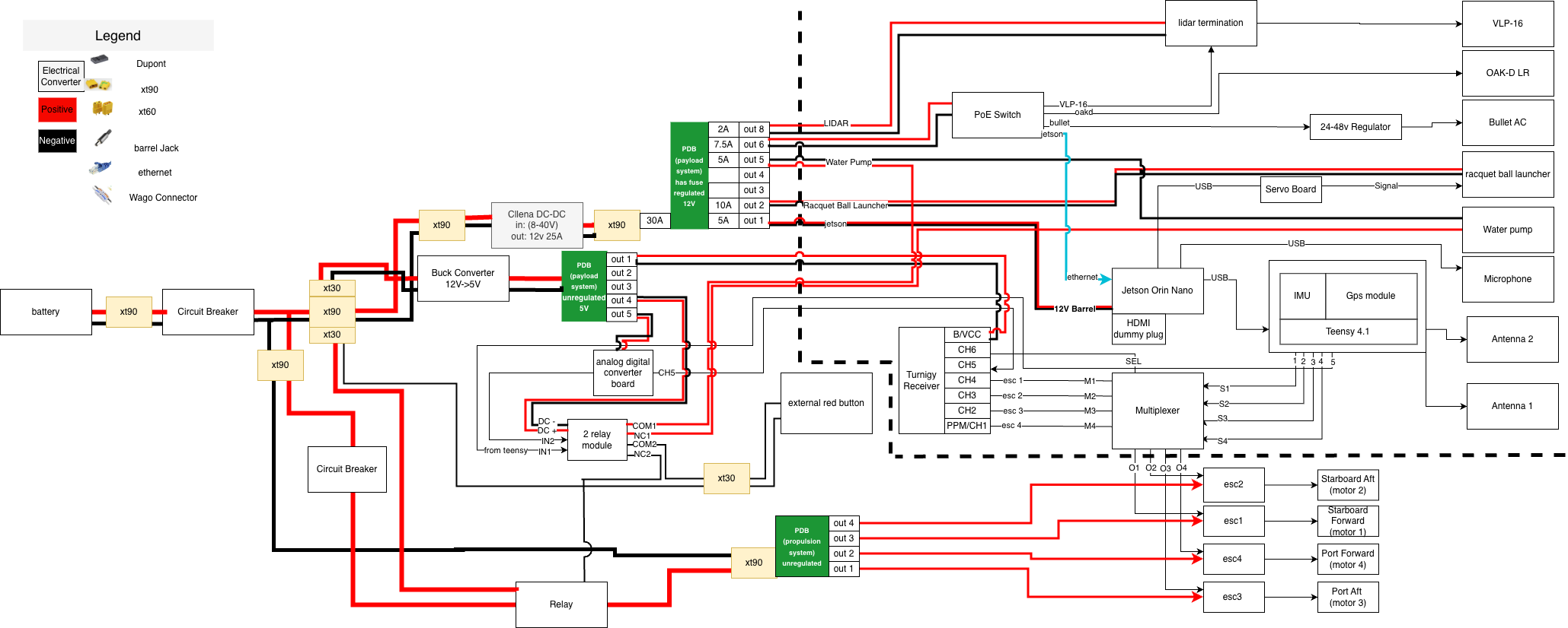 The electrical system is divided into two main parts, with each part housed in a separate section of the electrical box. The system is divided based on the interference caused by the electronic speed controllers, the high current carrying wires on the computational devices, and the magnetometer housed in the GPS module. These are located as far away from one another as possible.