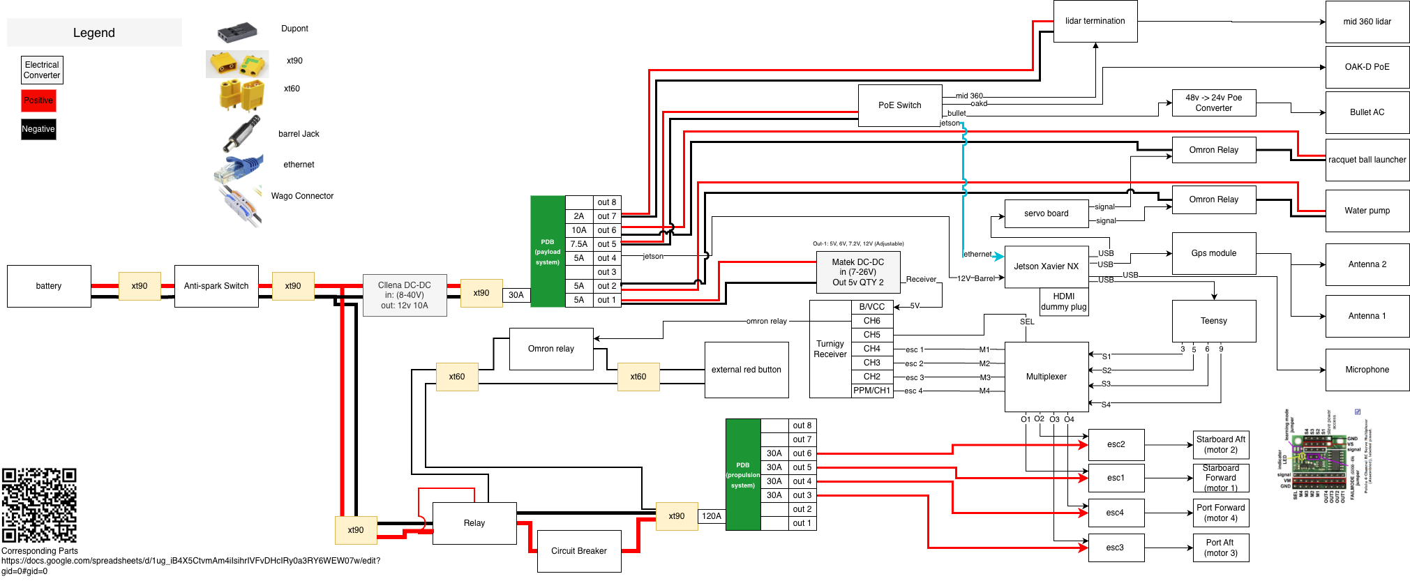 We updated portions of the electrical diagram to reflect recent hardware changes. The system now uses a Teensy 4.1 as the primary microcontroller and incorporates three power distribution boards: two unregulated boards and one regulated board with integrated fuse protection. Additionally, the single-channel relay modules were replaced with two-channel relay modules to improve control flexibility. The onboard computing platform has also been upgraded to the Jetson Orin Nano.