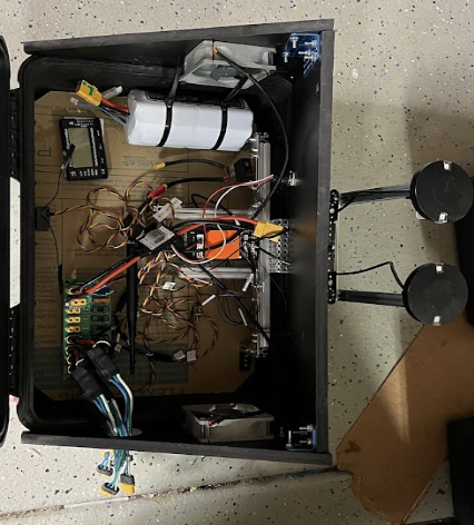 With an initial goal of basic RC control, we developed our barebones electronics system within a 20” x 14” Pelican case. By drilling holes through the sides, we routed our motor wires into the box and let an antenna out for our radio receiver. Each T200 motor was connected to a Blue Robotics Basic ESC which then connected to our flight controller, a PixHawk Cube Orange. The Pixhawk contains several internal redundant sensors including both compasses and IMUs essential for navigation. We also used two Here3 GPSes with an RTK system to provide centimeter level positioning data to the Pixhawk. Our comms were established through an RFD900x Long Range telemetry system which also interfaced directly through the Pixhawk. Everything was powered with two Blue Robotics 16Ah batteries in parallel allowing for roughly 4 hours of run time during testing.